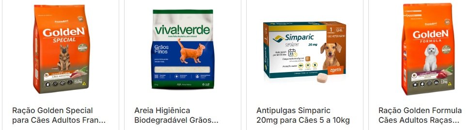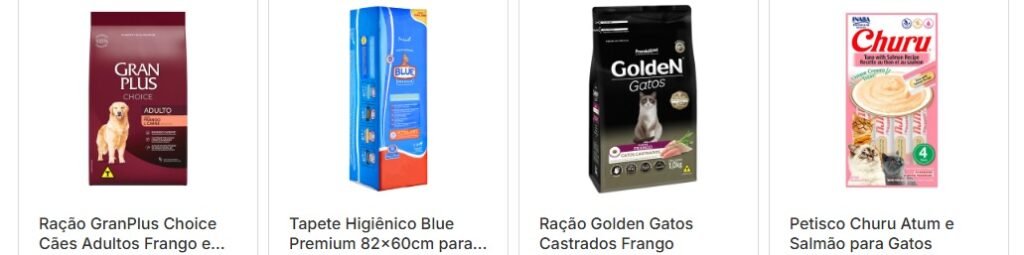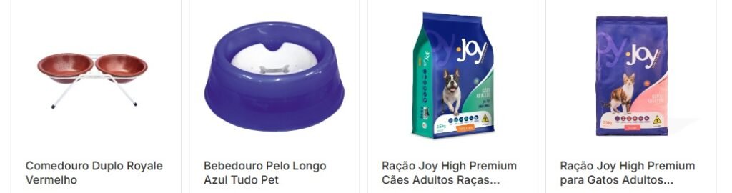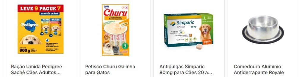 São milhares de produtos entre alimentação, saúde, higiene, brinquedos, acessórios, transporte, adestramento e muito mais.